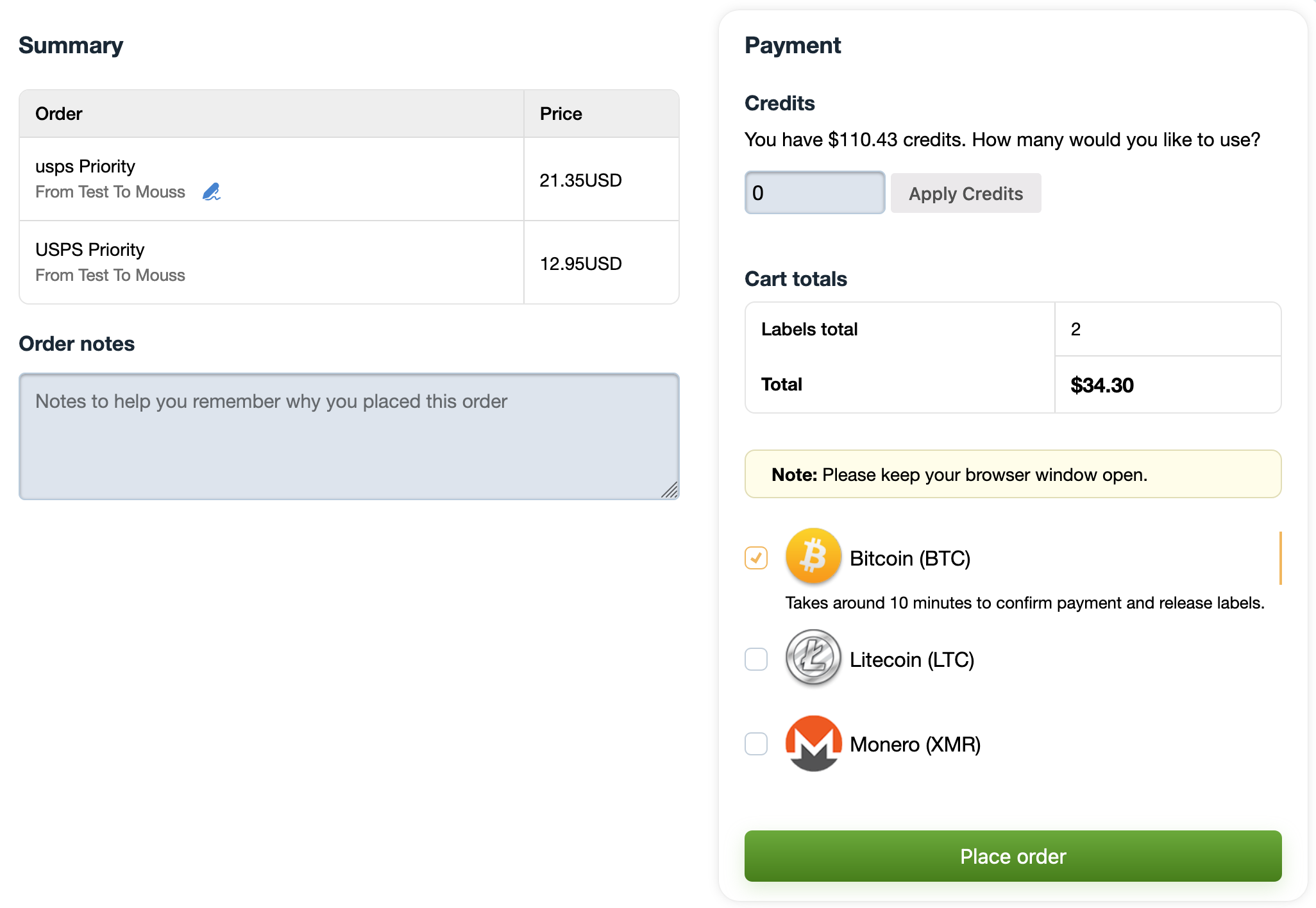 - Select the cryptocurrency you wish to pay with—Bitcoin, Litecoin, or Monero—and click “Place Order.”