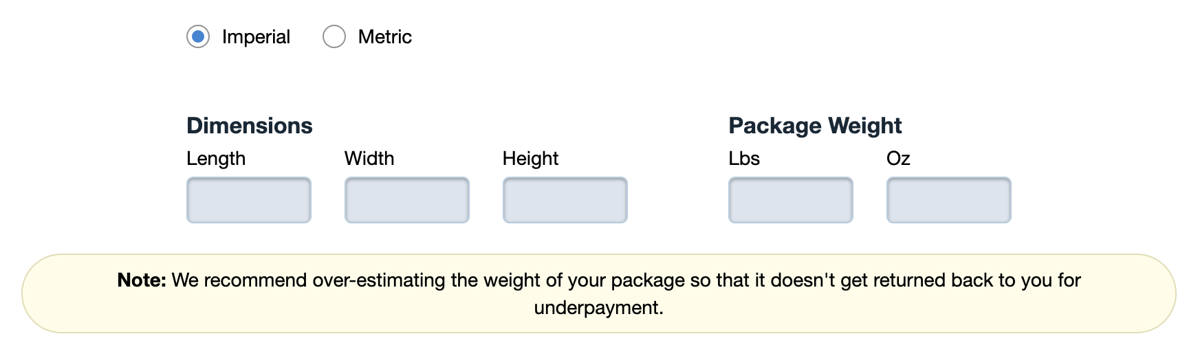- Enter your package’s dimensions.